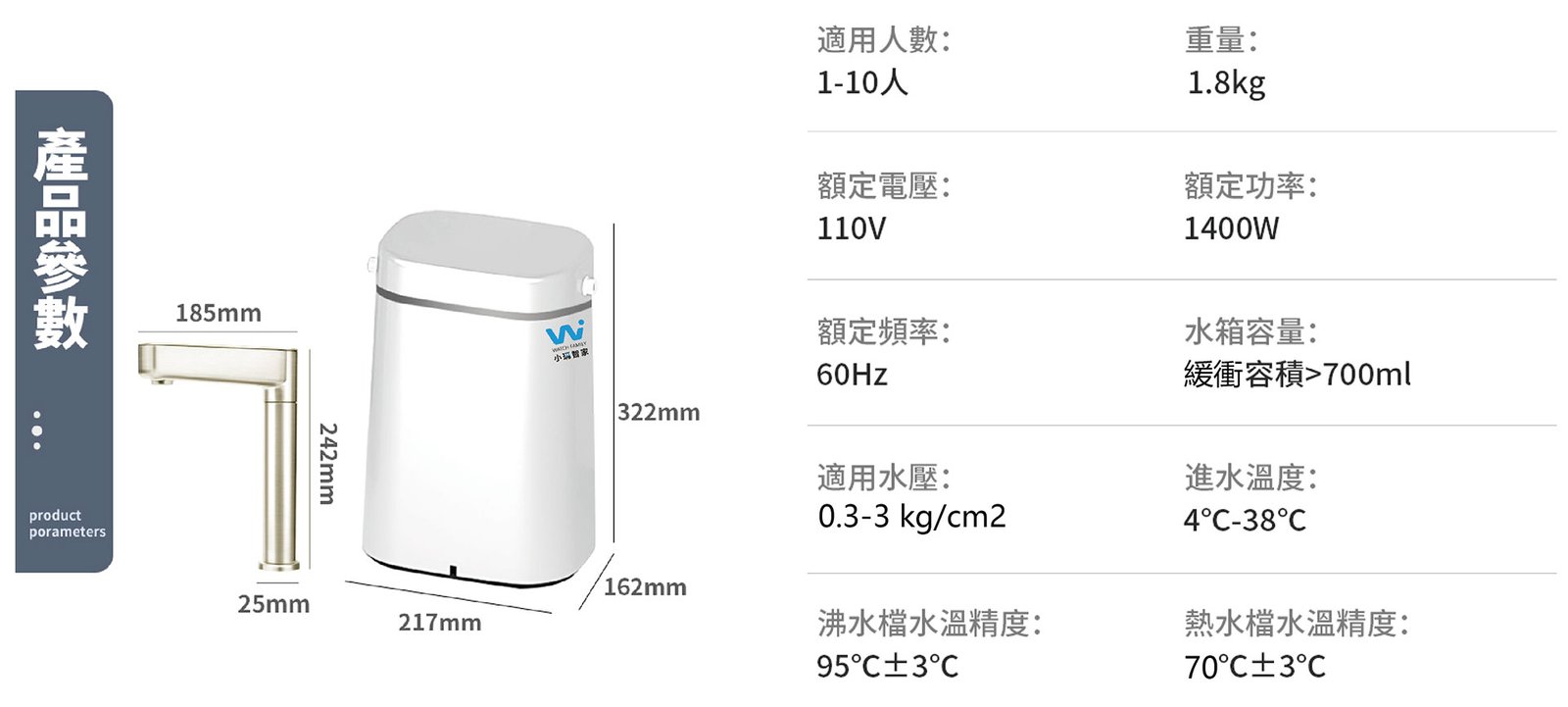 • 精準水溫 一鍵滿足3段不同出水溫度。泡茶、沖奶和常溫。